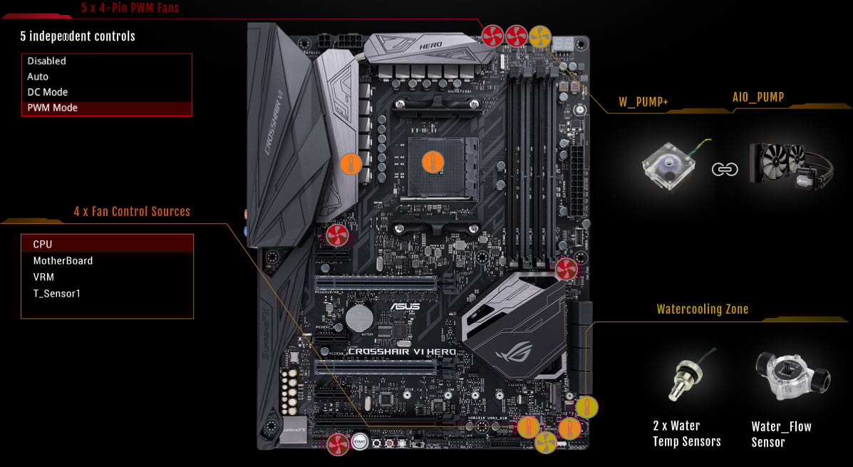 Med den innovativa ROG Water Cooling Zone kan du övervaka ditt kylsystem som aldrig förr. I ROG Water Cooling Zone finns dubbla headers för både vattentemperatur och flödeshastighet som matar information direkt in ROG Fan Xpert 4 så att du enkelt kan hålla koll på temperaturerna.