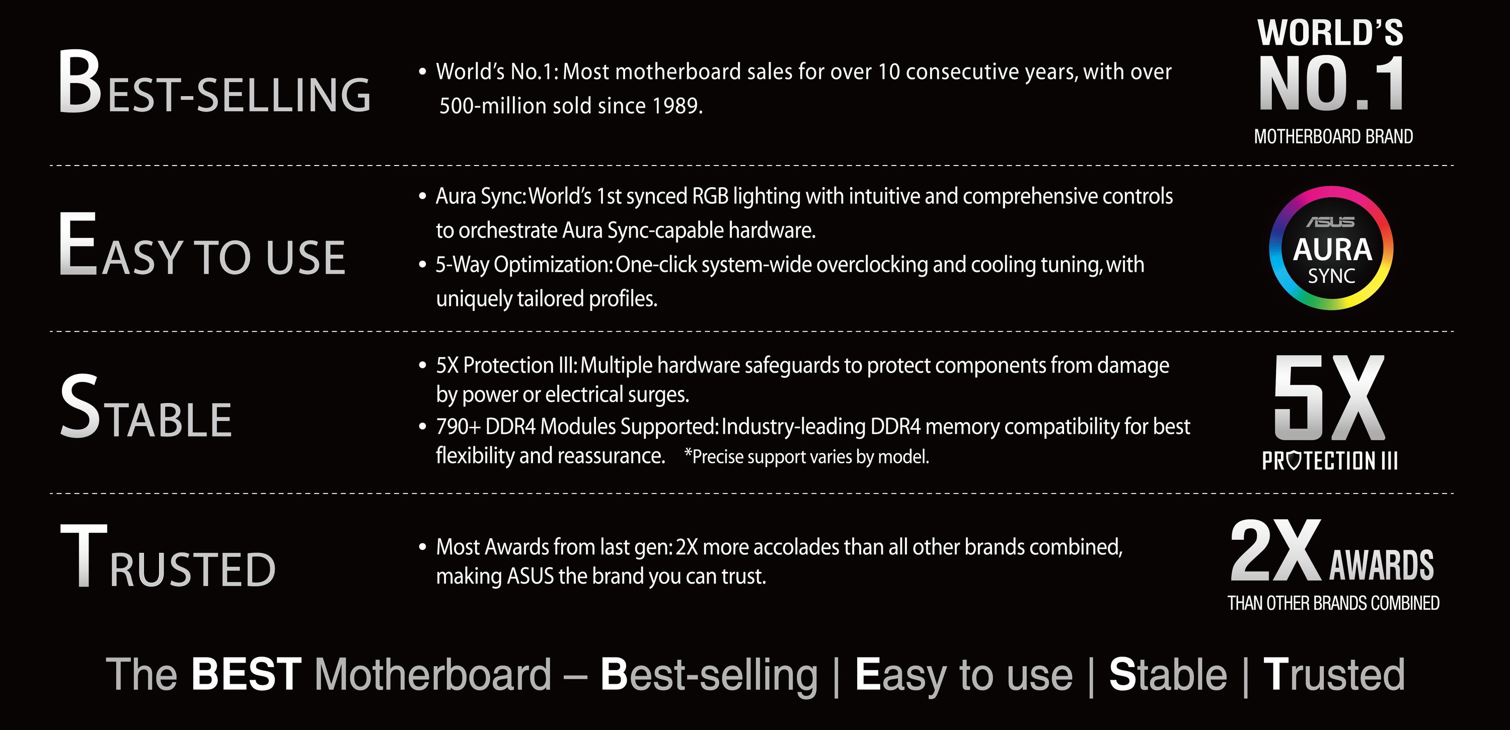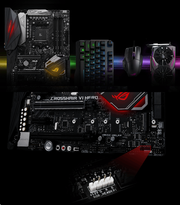 ASUS AURA ger full kontroll över din belysning med miljontals färger och en mängd olika förprogrammerade ljuseffekter. Anslut LED-lister till 4-pin RGB-headers på moderkortet och synkronisera all din belysning med hjälp av ASUS AURA Sync. Synkronisera även belysningen med växande mängd ASUS-hårdvara och skräddarsy din datorupplevelse.