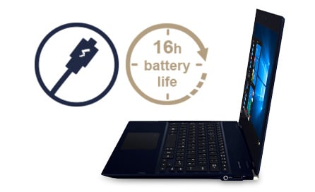 Portégé X20W-D är konstruerad för att du dagligen ska kunna arbeta bekvämt – med en batteritid på upp till 16 timmar (enligt Mobile Mark™ 2014) och stegladdningsteknik som ger ytterligare fyra timmar från en halvtimmes laddning. Lägg till en skärm med reflexfritt Corning® Gorilla® Glass 4, anslutningar som Thunderbolt 3 samt fantastiskt kristallklart ljud från Harman Kardon-högtalare och det finns inga hinder för att vara produktiv – oavsett var du arbetar.