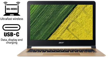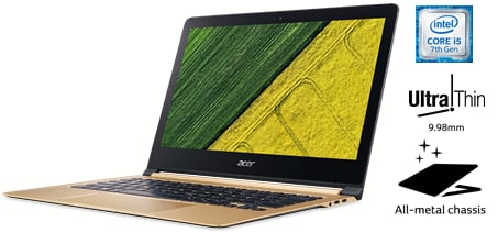 Acer Swift 7 är världens just nu tunnaste notebook med ett otroligt tunnt unibody-aluminium-chassi som bara mäter 9,98mm i tjocklek. Vikten är dessutom på låga 1.125kg. Trots detta så inkluderar Swift 7 sjunde generationens i5-processor, 8GB RAM-minne, 256GB SSD upp till 9 timmars batteritid.