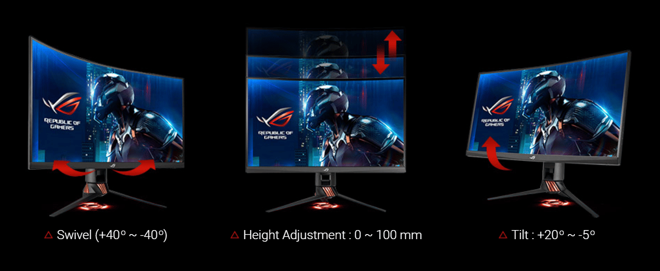 ROG Strix XG27VQ är utrustad med ett ergonomiskt stativ som kan vridas, lutas och höjdjusteras, så att du alltid får bästa möjliga betraktningsvinkel.