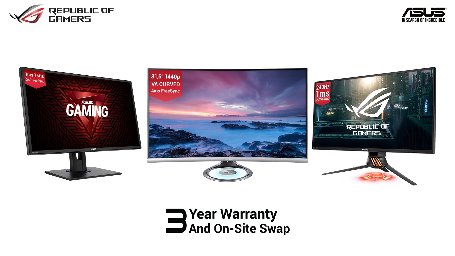 ASUS har stenhård kvalitetskontroll på alla sina produkter. Trots detta kan fel uppstå på skärmar som tillverkas med avancerad tillverkningsteknik. Uppstår fel inom 3 år som täcks av garantin levereras en ny skärm hem till dig direkt till dörren, samtidigt som den felaktiga byts ut. Du behöver inte vänta veckor på att skicka in din skärm för att få den lagad, istället får du den snabbt och smidigt utbytt. Få maximal trygghet med skärmar från ASUS!
