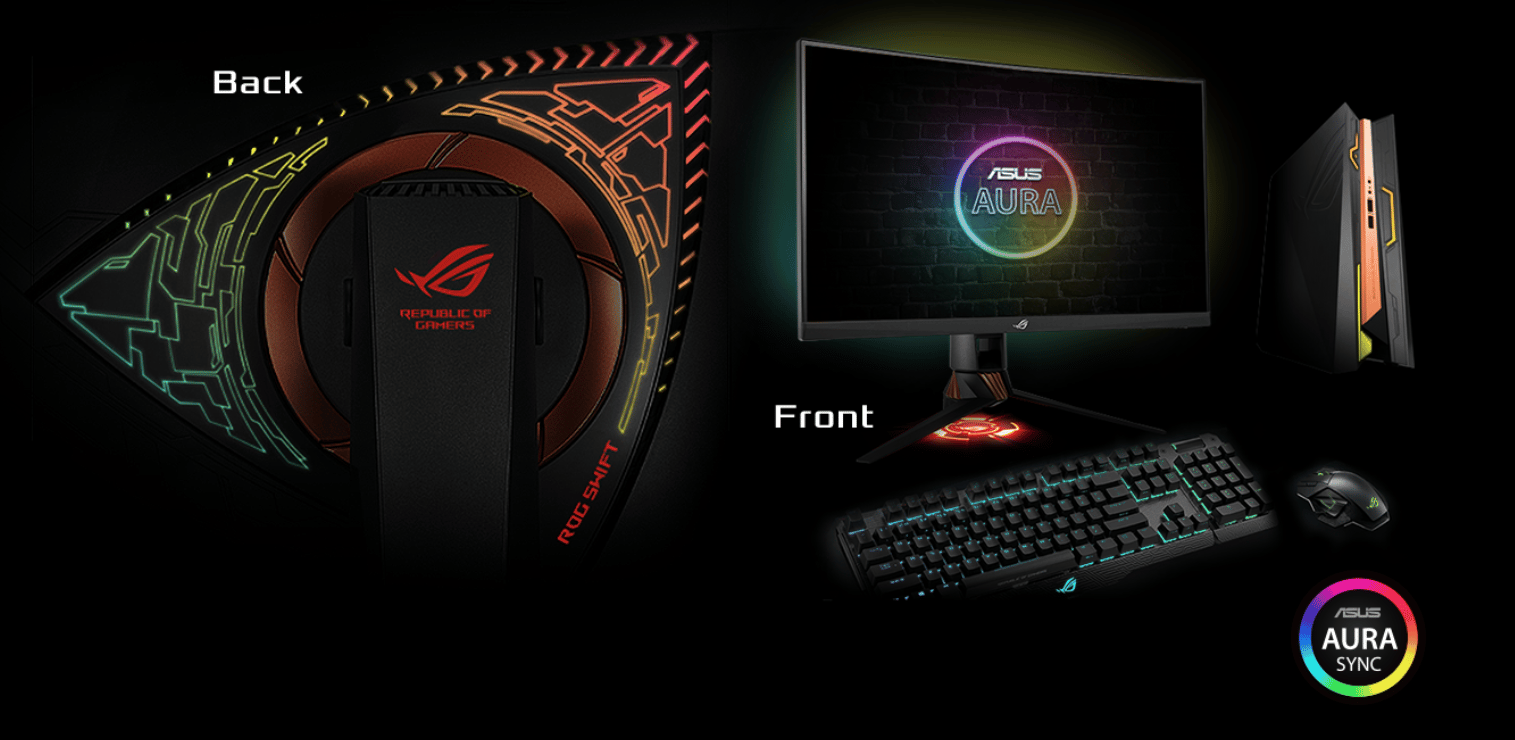 Den exklusiva belysningstekniken ASUS Aura Sync gör att Swift PG27VQ-belysningen kan synkroniseras med andra Aura-kompatibla komponenter och kringutrustning.
