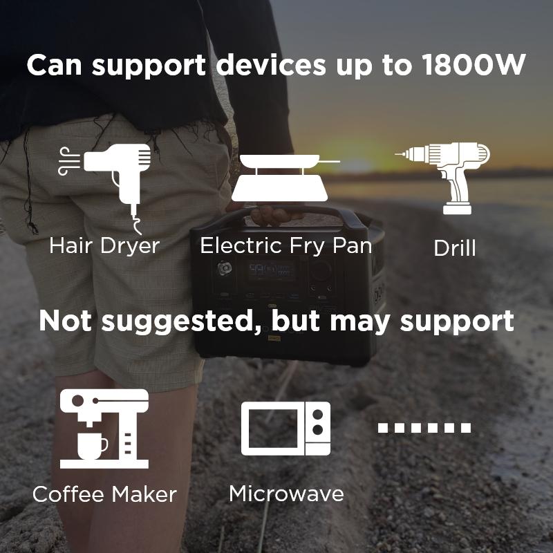 RIVER Pro levereras med två nätuttag. (Observera att den totala märkeffekten för de två AC-uttagen är 600 W (överspänning 1200 W). Med en inbyggd 600 W inverter kan RIVER Pro ladda enheter upp till 1800 W med X-Boost-läge på. Detta ger stöd för ett brett utbud av viktiga enheter som kylskåp, TV, bärbar dator, hårtork och mycket mer.