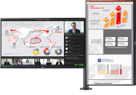 Med USB Type-C och DisplayPort stöder LG QHD Monitor Ergo Dual en Daisy Chain-inställning, så att du kan skapa en produktiv arbetsstation*. Anslut helt enkelt dubbla bildskärmar och en bärbar dator med en DP-kabel och en USB Type-C-kabel. Plus, med USB-C kan du använda och ladda den anslutna bärbara datorn samtidigt som du överför skärm och data samtidigt.