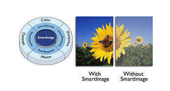 SmartImage är en exklusiv, ledande Philips-teknik som analyserar innehåll som visas på skärmen och ger dig optimerade skärmprestanda. Det användarvänliga gränssnittet ger dig möjlighet att välja olika lägen som kontor, foto, film, spel, ekonomi osv., efter det program som används. Baserat på det valet optimerar SmartImage dynamiskt kontrast, färgmättnad och bild- och videoskärpa för ultimata skärmprestanda – allt i realtid med en enda knapptryckning!