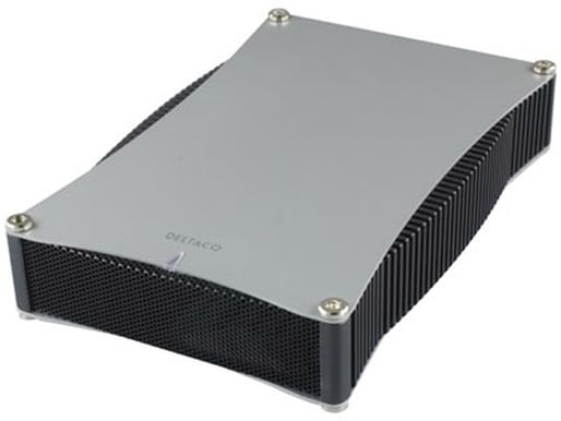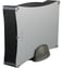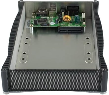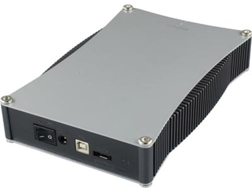 Externt kabinett med plats för en Serial ATA-300 hårddisk. Den kan anslutas till datorns USB-port eller eSATA-port. Det ingår ett fotstöd för att kunna montera den stående.