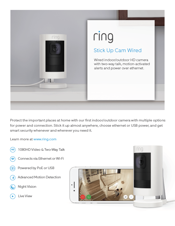 Stick upp Cam Wired är en mångsidig lösning som kan placeras på alla plana ytor eller monteras på en vägg för en mer permanent placering. Kameran ansluter till internet och får ström via Ethernet-kabel, eller ansluts via Wi-Fi och använder en USB-kabel för ström.