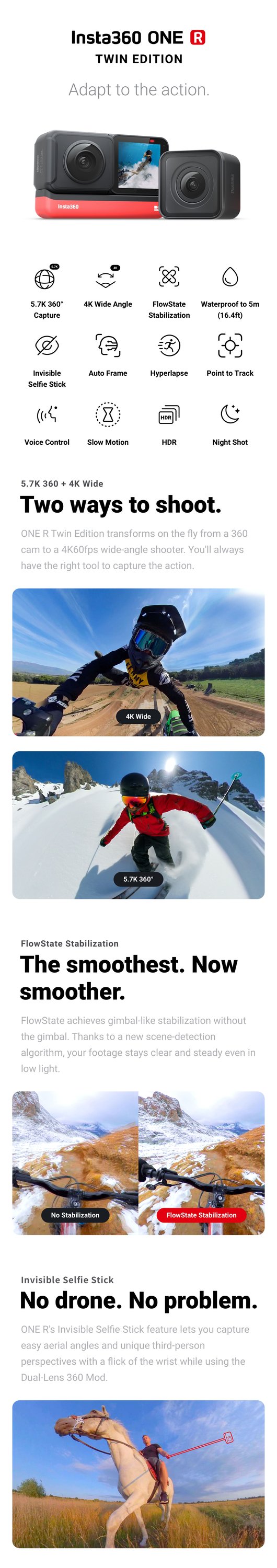Dual-Lens 360 Mod har Super 5,7K-upplösning, utnyttjar H.265-kodning, avancerad bildbearbetning och en AI-driven efterbehandlingsalgoritm för att bevara detaljer. FlowState uppnår gimballiknande stabilisering utan gimbal. Tack vare en ny scendetekteringsalgoritm förblir dina bilder tydliga och stabila även i svagt ljus.
