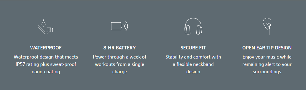 Ready to go the extra mile—or ten? Flexible and durable, BackBeat FIT pushes you further, withstanding the rain or a rinse under the tap with a waterproof design that meets the IP57 rating and an additional sweat-proof nano-coating. And whether you wear them running on a road or on a trail, the open ear tip design lets you hear the sounds around you.
