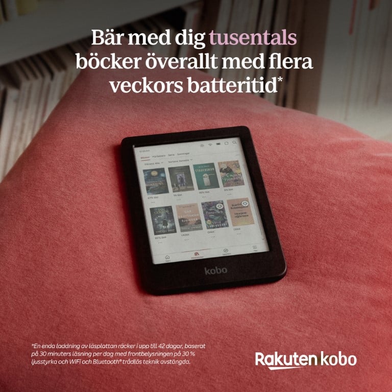**En enda laddning av läsplattan räcker i upp till 42 dagar, baserat på 30 minuters läsning per dag med frontbelysningen på 30 % ljusstyrka och WiFi och Bluetooth® trådlös teknik avstängda.