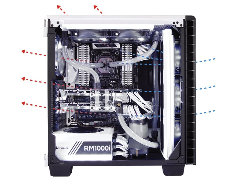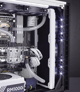 400C-modellen har utrymme för en kylare på 360 mm längst fram, en 240 mm stor kylare längst upp, och en 120 mm stor kylare längst bak. Med andra ord kan du välja att tysta ner din GPU och CPU med vätskekylning på flera olika platser.