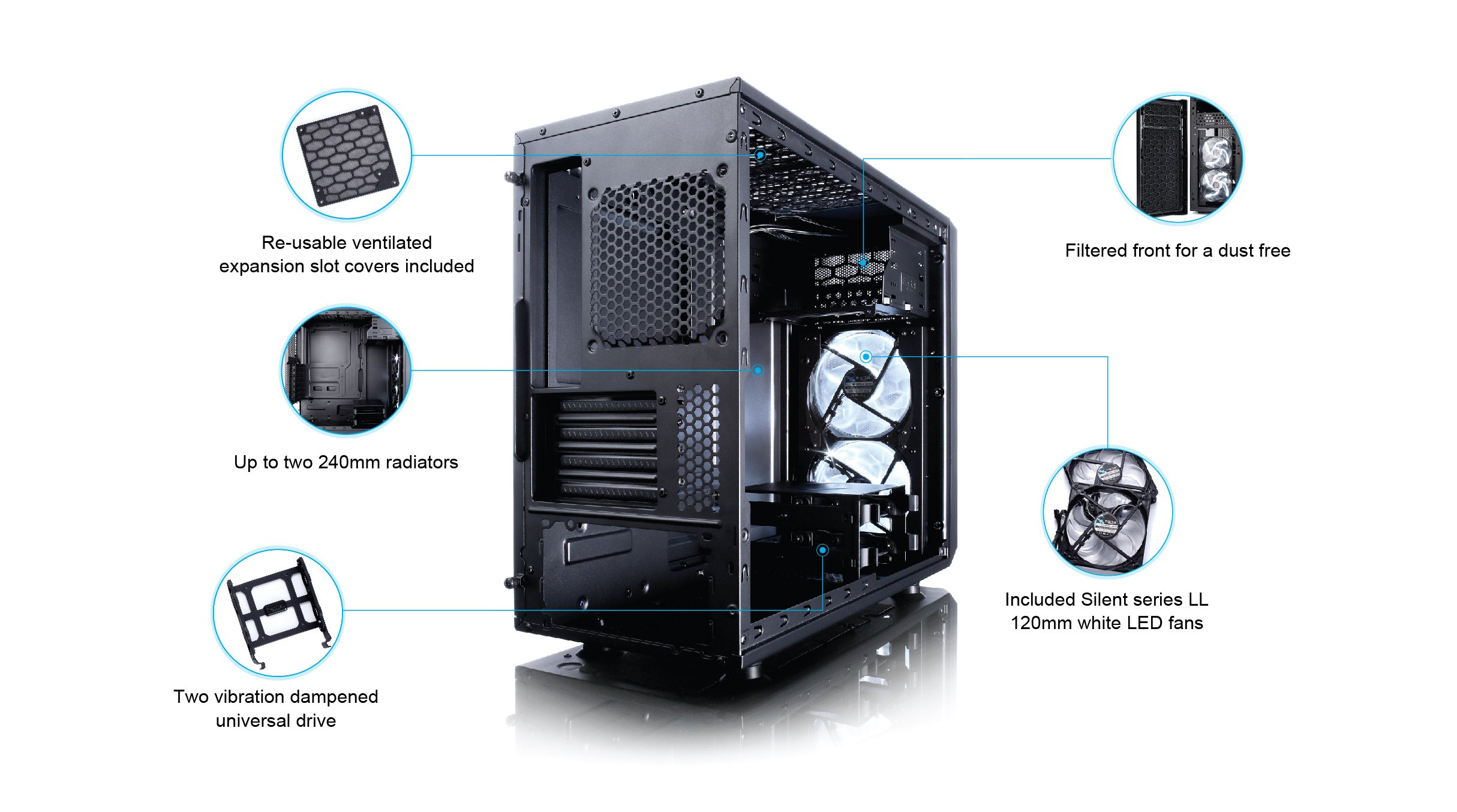 - Two preinstalled Fractal Design Silent Series LL 120mm White LED fans