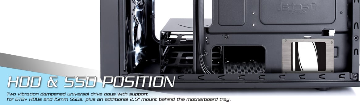 - Two vibration dampened universal drive bays with support for6TB+ HDDs and 15mm SSDs, plus an additional 2.5" mount behind the motherboard tray