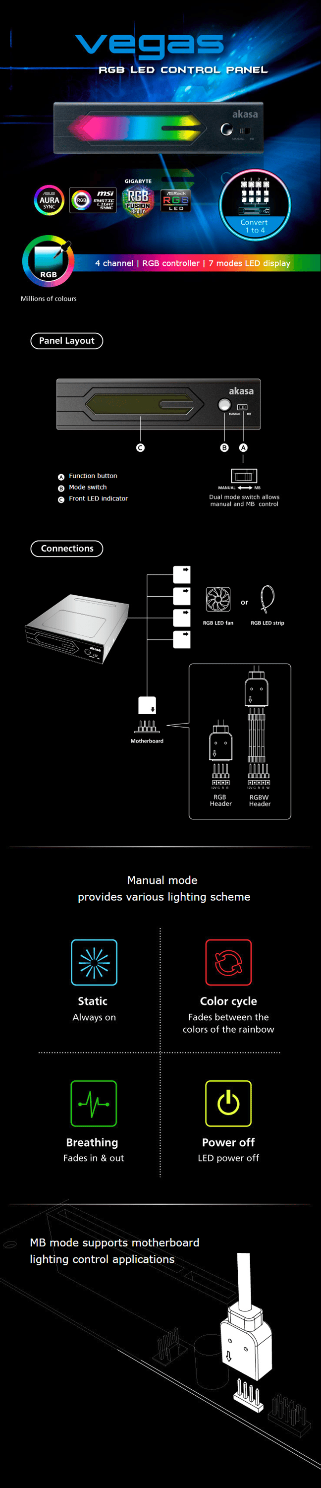 Panelen har en lättanvändlig brytare så att du kan ändra från M/B-kontroll eller Manuell styrning efter din smak. Själva panelen har en mode-switch, en funktionsknapp, RGB-kontakter, 12v Sata-strömkontakt och en RGB-ingångskontakt.