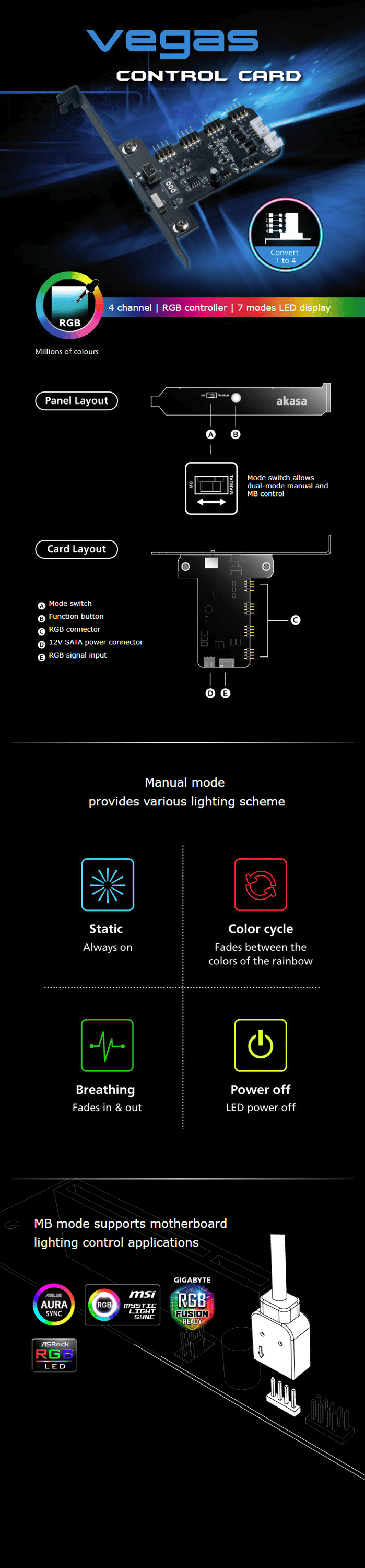 Kortet har en lättanvändlig brytare så att du kan ändra från M/B-kontroll eller Manuell styrning efter din smak. Själva kortet har en mode-switch, en funktionsknapp, RGB-kontakter, 12v Sata-strömkontakt och en RGB-ingångskontakt.
