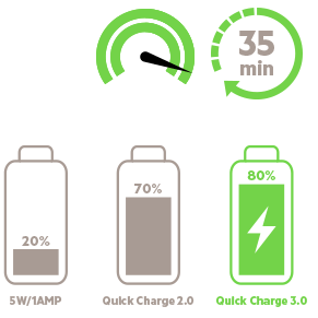 Qualcomm Quick Charge 3.0-tekniken ger varje ansluten enhet rätt mängd effekt och utvärderar laddningsenheten varje 20 mV, vilket säkerställer att den alltid laddar med optimal hastighet.