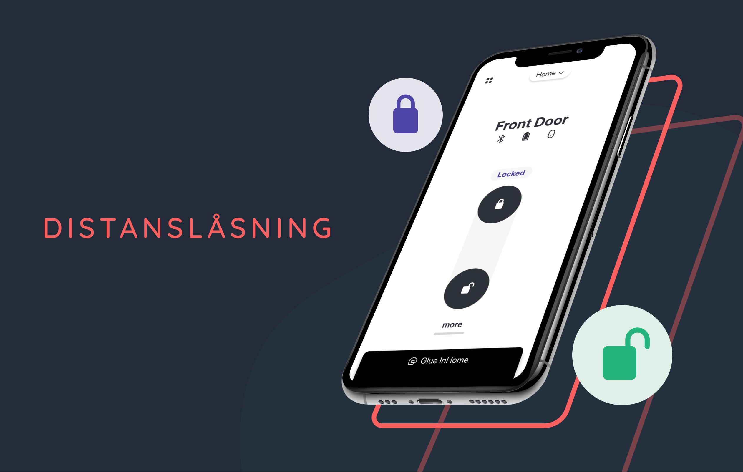Med Glue WiFi Hub kan du låsa upp med din telefon var du än befinner dig. När du är inom 15 meter från ditt Glue Lock ansluter Bluetooth direkt till ditt lås. Fjärrupplåsningssignalen är krypterad och använder samma säkerhetsstandard som mobilbanker och Bank-ID.