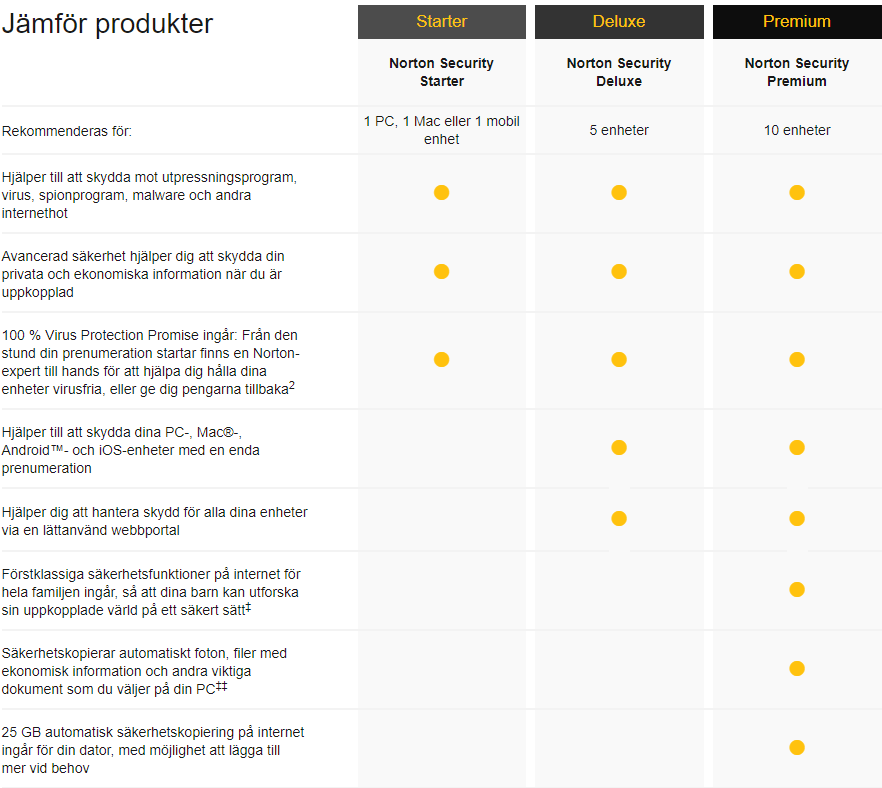 Norton Security Deluxe ger ett komplett skydd för upp till 5 datorer (Windows/Mac), surfplattor eller mobiltelefoner. Dessutom kan du till skillnad från Starter hantera skyddet för alla enheter via en lättanvänd webbportal. Har du endast en dator som du vill skydda bör du kika på Starter. Är det istället så att du vill skydda upp till 10 datorer, surfplattor eller mobiltelefoner bör du kika på Premium.